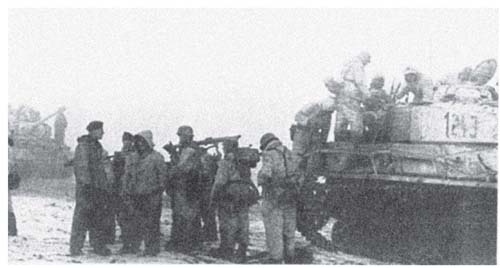 在坦克的支援下,一群德军步兵正在准备进攻行动。