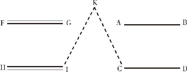 当没有这种中心位置时,可以利用机动线的相对方向来代替这种中心位置。如示意图(三)所示,CD军运动到AB军正面的右翼,HI军则运动到FG军的左翼位置。于是,AB和FB两条外线的顶端便形成了两条内线,即CK和IK。利用CK和IK的会合兵力,就可将AB和FG各个击破。在1796年、1800年、1809年的一些战争中,我们能经常见到这种情况。