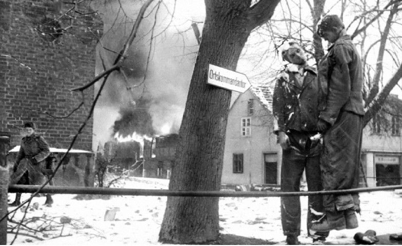 被苏军吊死的“俄罗斯解放军”士兵,苏军对“叛徒”从不“手软”。这时,“俄罗斯解放军”第1师的师长比亚琴科忽然发现他们没有得到德军承诺的空中或炮火支援,因此私自将部队撤下阵地。在这次战斗中,弗拉索夫的部队有370人阵亡,其中包括4名军官。得到消息的比塞大发雷霆,克莱勃斯将军直接下令将这支部队撤了下来,并收缴了他们的武器。然而弗拉索夫的士兵们有苦难言,他们的撤退完全是因为缺乏火力支援,他们并不知道德军炮兵正在为迎击苏军总攻节省出他们最后的炮弹。