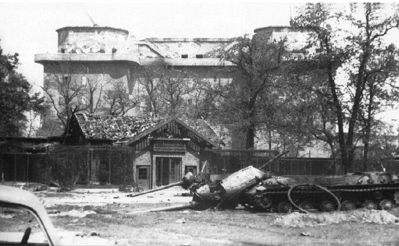 柏林“动物园”高射炮堡垒前的2辆苏军JS-2“斯大林”式重型坦克残骸,殉爆的车载弹药炸飞了它们的炮塔,乘员也就无一生还。听了加尔的话,党卫军的军官们眼神中充满了仇恨,死死地盯着面前的2个苏联人。气氛忽然变得紧张,格里申担心冲突会一触即发。他表示,德军需要在下午3点之前做出决定。在一片死一般的寂静中,2名苏军军官离开了。当他们爬下绳梯时,显然有些紧张并发抖,他们担心党卫军会把绳子割断。到了地面以后,他们很想跑步回到安全区域,但是他们没有明显地大步快跑。到了树林,苏联的同志们跑上来亲切地拥抱了他们,加尔表示德国人还没有表态,所以现在只能等下去。