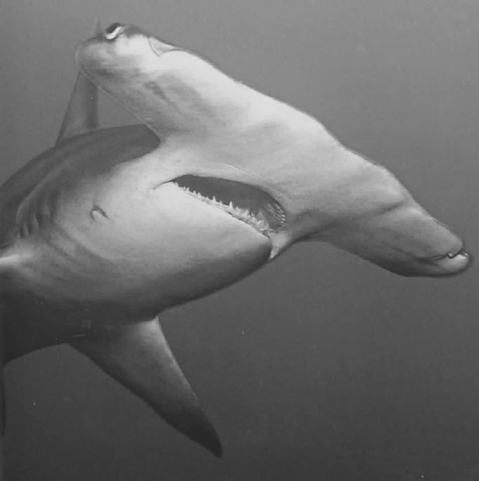 海伦娜夫人与丈夫来到甲板上,一起兴致勃勃地观看水手们如何将这家伙钓上来。海水清澈碧蓝,水天一色。锤头鲨在水中蹿上蹿下,那一招一式都清楚可见。遵照船长的命令,水手们从船的右舷抛下一条很结实的绳索,绳子的一端绑一只大铁钩,钩上挂块厚厚的腊肉作为鱼饵。那鲨鱼还有足足50码远,嗅到肉腥味后,霎时间,就挺直尾鳍,迅速朝游艇冲了过来,鱼鳍掀起数尺高的浪花。在离猎物越来越近时,它大而突出的眼睛炯炯发光,露出一股狼顾鸢视的神态。翻身时,可以看到它大下巴上长着4排锋利的大白牙,整个脑袋又宽又平,活像一把长柄上的双头铁锤。约翰·蒙格尔斯没有看错,这绝对是一条贪馋无比的锤头鲨。