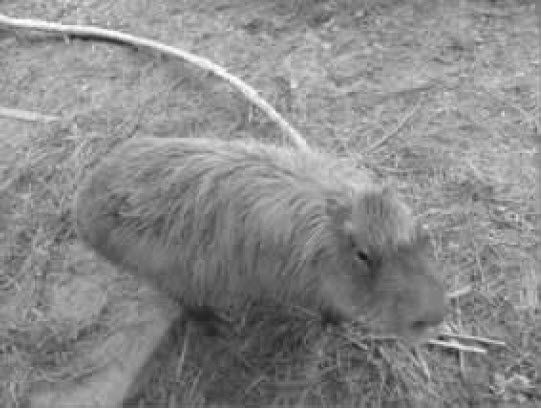 这时候水豚停止了跟狗的搏斗。它有着很厚的眼睑,陷在里面的眼珠笨拙地转动着。这也许还是它第一次见到人类。