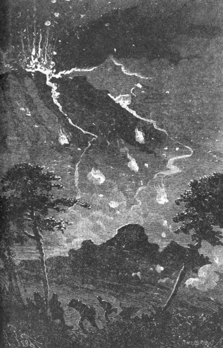 居民们想去富兰克林山较高的火山锥坠落的那片平原上,但他们被岩浆挡住了去路。岩浆沿着红河河谷和瀑布河河谷分两路流下,所过之处,蒸发掉了所有河水。居民们不可能跨过岩浆的洪流,只能后退。火山到了顶之后,已不像原来那样了。在上面替代古代火山口的是一片平顶,如同桌面。在南边和东边各有一个不断涌出岩浆的喷口,形成了两股洪流。新火山口上升起一片夹带着灰垢的烟尘,它们跟大气里的密云混合,笼罩整个荒岛。雷鸣连成一片,难以分清究竟是雷声还是火山的声音。燃烧的石块被从火山口里直射到1000英尺高的空中,然后爆炸,一道道的闪电和火山互相媲美。