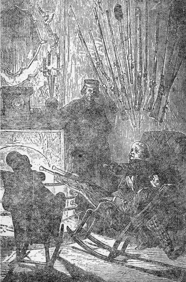 “唉!别指望打仗了!”大名鼎鼎的J. T. 梅斯顿用铁钩子手挠了挠橡胶做的头骨说道。“天边一丝云彩也没有!这正是制炮学大有可为的时候!喂,先生们!本人告诉你们,就在今天早晨我刚刚完成了一款迫击炮的设计,这炮肯定能改变战场上的局面!”
