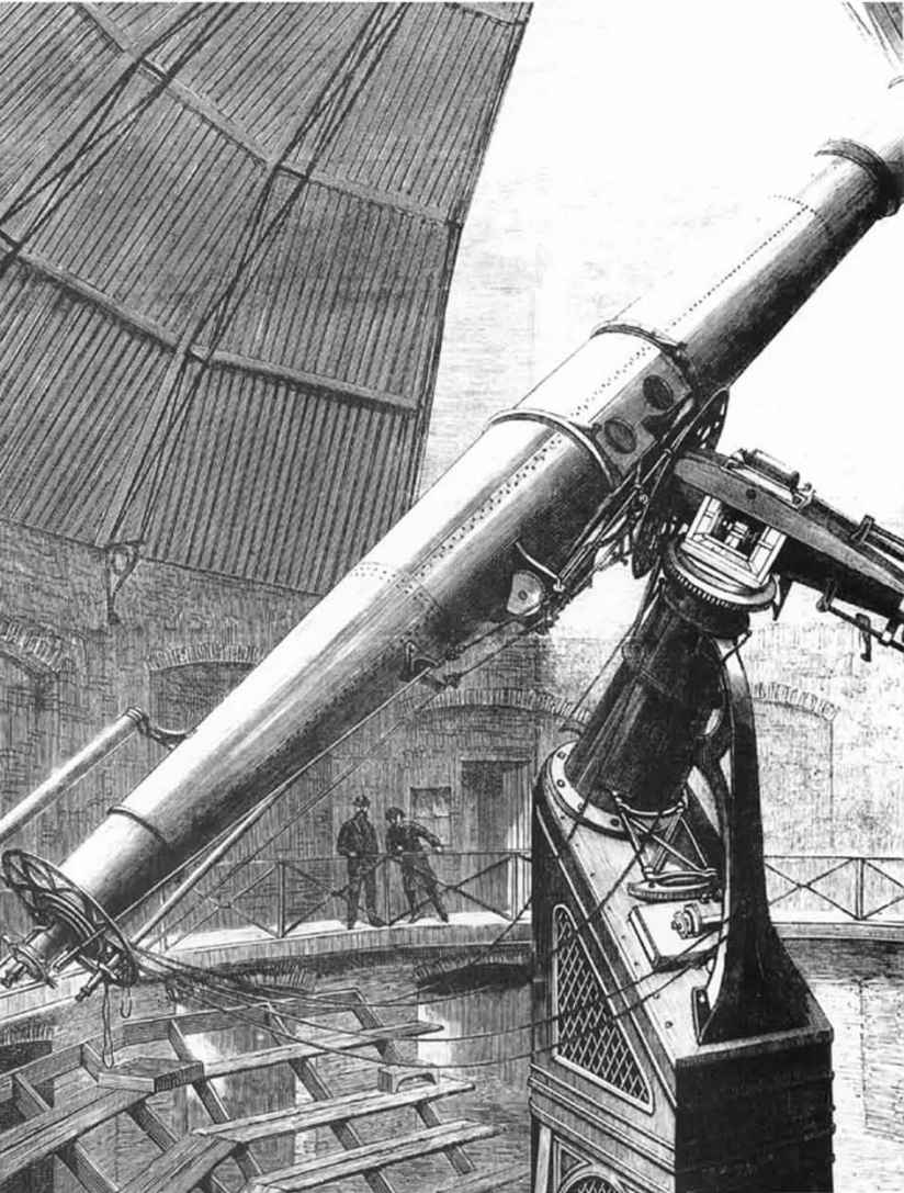 至于这些美国工程师们所克服的种种困难以及他们展示出来的大无畏惧的天才和精湛技艺,不是笔墨和语言能描述清楚的。他们必须远离人烟,到人类几乎无法生存的原始荒野里去。他们穿过没有人迹的草地和密不透风的大森林,跨过湍急的河流,爬上终年积雪的大山,把巨石、大量的铸铁、笨重的角铁、硕大的镜筒部件和重达30000磅的反光镜抬到10000多英尺的山顶上去。但是美国人的天才克服了这些数不清的障碍。到了9月底,不到半年的时间,一架巨型的反射望远镜落成了,长度是284英尺,巍然矗立,高耸入云。望远镜被一个巨大的铁架子支着,通过一台精密的装置对其操纵控制,使它可以随意对准天空的任何地方,从一边的地平线追踪着空中的天体,一直追踪到另一边的地平线。