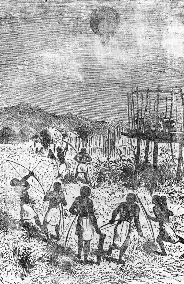 最后,当他们终于看到空中的气球,激烈的战斗立刻暂时停了下来。不过,他们的喊叫声变得更为激烈,一些箭开始射向“维多利亚”,其中一支甚至非常靠近吊篮,以至于乔一把将它抓在手中。