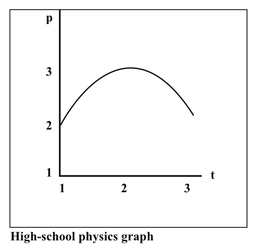 高中物理的运动图表展示出的时间正像是与空间维度相当的另一维度。这一图表(“高中物理图表”)描绘的是一颗粒子在某个空间维度中沿时间发生的运动。这个粒子在初始时刻1从空间坐标2出发,然后向空间坐标3移动,至时间刻度2减速并停止,最后在时间刻度3回到空间坐标2的位置。这个二维图表中的每一点代表一个时间t(水平坐标)以及一个在空间p的位置(垂直坐标)。如图所绘的曲线代表这个粒子的运动。当曲线经过一个点(t,p),就意味着粒子位于地点p和时间t。
