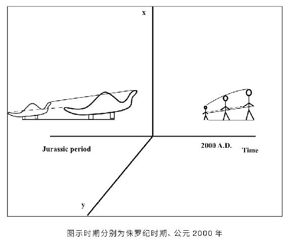 这些更加复杂的图示被称为时空图解。(甚至高中物理图示都是较为简单的时空图解)时空图解可以用于展示所有的历史,凡是曾经发生或将会发生的事情都能套入某个时空图解。本文中这一图解展示的是一只远古时期的恐龙和一个出生在公元2000年的人类。这些物体在图示中水平延伸,是因为其在现实中跨越了时间,而时间在图示上是水平轴:各个物体沿着水平时间轴存在于不同节点。其也在图示的另外两个维度延伸,是因为恐龙和人类在现实中占据了空间:这些物体沿着垂直空间轴存在于不同节点。