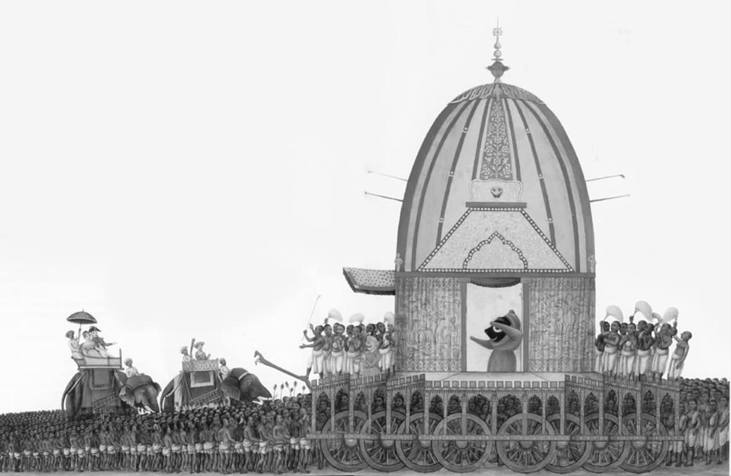 走在游行队伍前面的,是一些头戴高帽、身穿花袈裟的僧侣,他们四周簇拥着很多男女和小孩子。这些人大声唱着挽歌,歌声和锣鼓声互相交替,此起彼伏。在人群后面,跟着一辆大轱辘车,车身和车轮上都雕刻着缠绕在一起的毒蛇。车上有一尊面目狰狞的神像,由四匹披着华丽挂毯的牛拉着。这尊神像生有四条胳臂,全身呈暗红色,披头散发,眼露凶光,吐着长舌,两片嘴唇涂成酱红色,脖子上戴了一个骷髅头项圈,腰上系着由断手连接成的腰带。它赫然矗立在一个趴伏的无头怪兽身上。