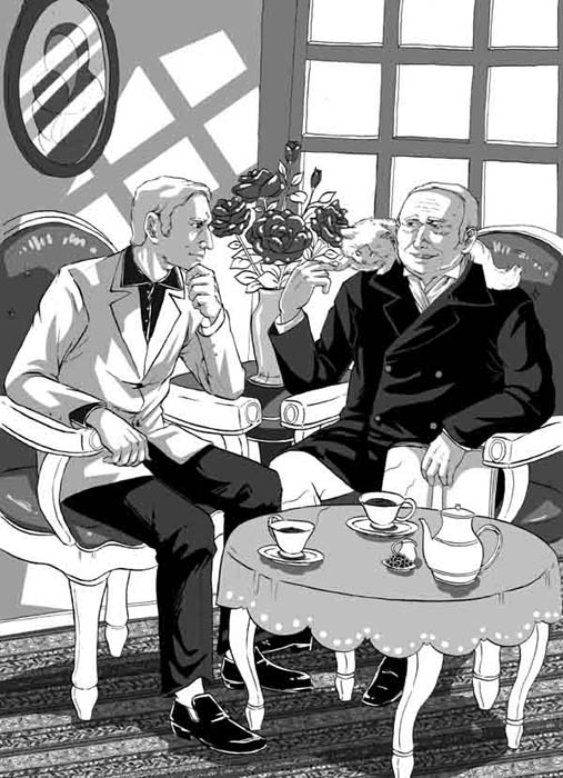 “那时候我们还有一位乡邻,叫斯捷潘·尼克托波里昂内奇·科莫夫。他把我父亲折腾苦了,真是想尽办法折腾人。这人是一个酒鬼,而且喜欢摆酒席,等到他喝得差不多了,用法语说一声‘这很好”,再把嘴唇一舔,就闹哄起来,闹得六神不安!他派人去请所有的乡邻都到他家里来。他的马车都是现成的,停在门口等你,你要是不去,他立刻亲自闯进来……而且这人有多么怪呀!他清醒的时候不说谎,可是一喝了酒,就胡吹起来,说他在彼得堡喷泉街上有三座房子:一座是红的,有一个烟囱;一座是黄的,有两个烟囱;还有一座是蓝的,没有烟囱。说他有三个儿子(其实他还没有结过婚):一个在步兵队伍里,一个在骑兵队伍里,还有一个没有当差……又说,每座房子里住着他一个儿子,常到大儿子家里来的是海军将领,常到二儿子家里来的是将军,到三儿子家里来的全是英国人!说着说着,就站起来,说:‘为我大儿子干杯,他是最孝顺我的!’于是就哭起来。谁要是不举杯祝酒,那就糟了。‘枪毙你!’他说,‘还不许埋葬!……’要不然就跳起来,叫喊:‘大伙儿来跳舞吧,自己快活快活,也让我开开心!’那你就得跳,就是死也得跳。他把自己的农奴家的姑娘们折腾得要死。常常让她们通夜合唱,一直唱到天亮。谁唱的嗓门儿最高,就奖赏谁。如果唱得没了劲儿,他就用手托住头,伤心起来:‘唉,我这无依无靠的孤儿呀!大家都不睬我,好可怜呀!’于是马夫们立刻就给姑娘们鼓劲儿。我父亲也让他喜欢上了。有什么办法呢?差点儿把我父亲折腾死,本来是会折腾死的,幸亏他自己死了:是他喝醉了从鸽子棚上跌下来摔死的……瞧,以前我们就有这样一些乡邻!”
