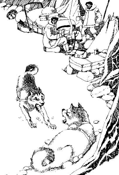 毕罗尔特大骂一声,木棒又重又响地落在了一个瘦骨嶙峋的躯体上,一声痛苦的尖叫,一场混战突发而至。在它们的营地突然出现了鬼头鬼脑的毛茸茸的畜生——一群饿得半死的爱斯基摩犬,有近百只。它们不知从哪个印第安村庄嗅觉到了这个营地。当巴克和丝毛犬打架的时候,它们已经偷偷地靠近了,并且,当这两个男人挥舞着粗壮的木棒在它们中间跳来跳去的时候,它们露出了犬牙,进行反击。食物的香味让它们发狂。毕罗尔特看到一只狗头伸进了食物箱。他的木棒便重重地落到了它骨瘦如柴的身上,食物箱被掀翻了。顿时,近二十只饥肠辘辘的畜生一同扑向面包和咸肉。棍棒打在它们身上,都全然不知。木棒像雨点般落在它们身上,它们又嗥又叫,但仍然在拼命抢着吃,直至将最后一块面包吞食干净为止。