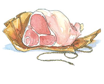 用一只蹄膀,不用猪爪,白水煮烂,去掉汤水,加一斤好酒、半酒杯清酱、一钱陈皮和四五个红枣,煨煮得烂熟。起锅时,泼洒一些葱花、花椒末和酒,去掉陈皮和红枣,这是一种做法。又有一种做法:先用虾米熬的汤代替水,加酒和酱油煨煮蹄膀。又有一种做法:用一只蹄膀,先煮熟,用素油把猪皮炸皱,再加作料红烧煨煮。有些土人喜欢先吃带皱的皮,说这是“揭单被”。又有一种做法:一个蹄膀,用两个钵扣合装起,加酒和酱油,隔开滚水蒸熟,不超过二支香的时间,叫作“神仙肉”。钱观察的家厨做的最好吃。