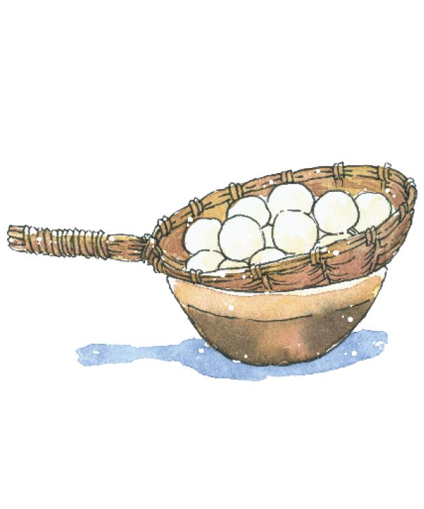 活的白鱼和青鱼,剖开成两半钉在木板上,用刀刮下鱼肉,只有鱼刺留在木板上。把鱼肉剁成肉泥,加豆粉和猪油,用手搅拌均匀,放一点点盐水,不用清酱,加葱和姜汁,捏成团,在滚开的水中煮熟后捞起来,泡在冷水里,要吃的时候就放入鸡汤和紫菜一起煮。
