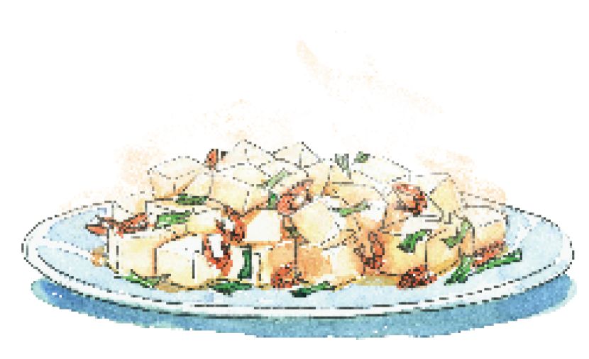 用陈年虾油替代清酱炒豆腐,豆腐必须两面煎黄。油锅要很热,用猪油、葱花和花椒。