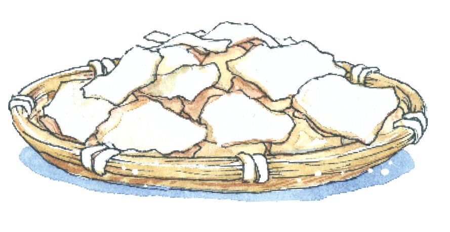 把精面粉浸透,制作成小片,用猪油灼烤,起锅时加糖粒,颜色白如霜,入口即化。杭州人称之为风枵。