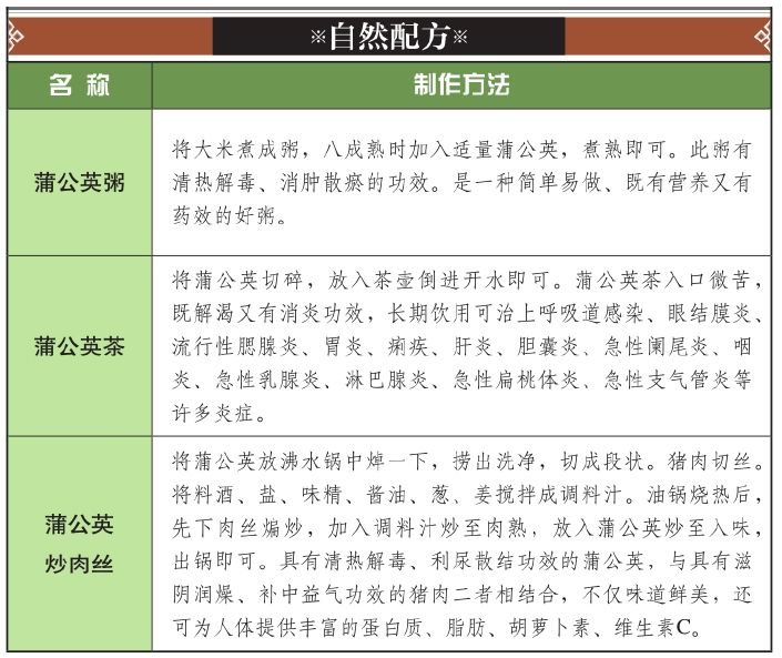 蒲公英俗称尿床草,对于利尿有非常好的效果。它具有丰富的维生素A和维生素C及矿物质,对消化不良、便秘都有较好的改善作用。另外还有消炎和改善湿疹,舒缓皮肤炎、关节不适的净血功效,花朵煎成药汁可以去除雀斑,有美容的作用。