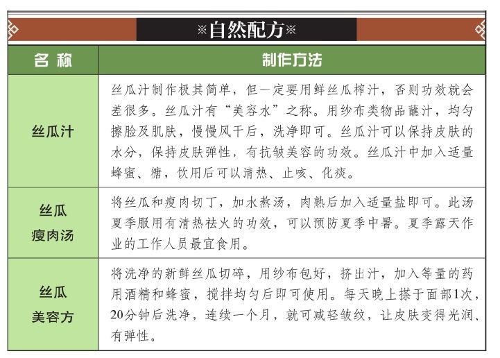 丝瓜中的维生素C含量较高,可用于抗坏血病及预防各种维生素C缺乏症。丝瓜中的维生素B有利于小儿及中老年人大脑保健,有预防老年痴呆的功效。另外,丝瓜也是美容的佳品。