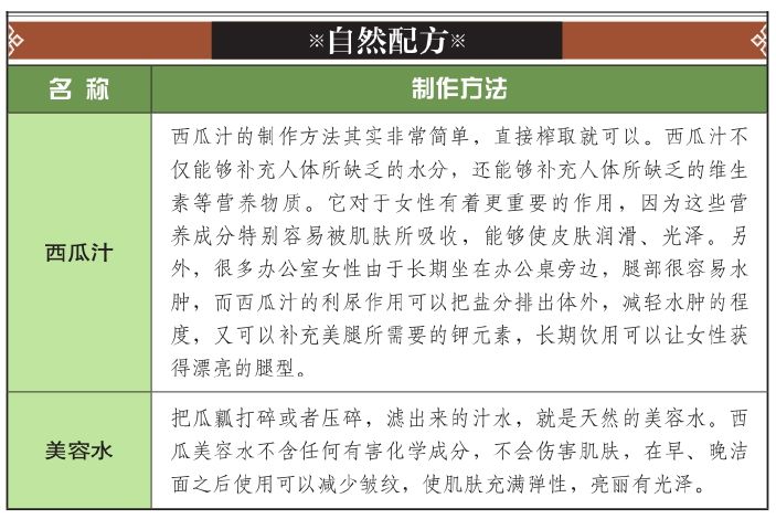 西瓜可以清热解暑,补充身体所缺乏的水分,利尿,对黄疸有一定的治疗作用。另外,新鲜的西瓜汁和瓜皮还有美容的效果。