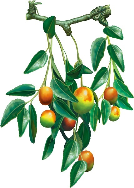 枣树是红色的,且有刺,四月份就会长出有光泽的小叶,五月份开小白花。枣在南方、北方都有,但只有在青州、晋州这两个地方生长得最好,又大又甜,也可以入药。枣的种类很多,名称也非常多,如狗牙、鸡心、牛头、羊矢、细腰、赤心、三星、木枣、夕枣、白枣、棠枣,等等。等到枣全红时,摘下来晒干,外皮是红色而发皱的;枣半红时,果肉不丰满,晒干后就是黄色的。把枣切开晒干的叫枣脯,把枣煮熟后榨出的汁叫枣膏,把枣蒸熟的叫胶枣,蒸之前加入糖和蜂蜜,味道更好。