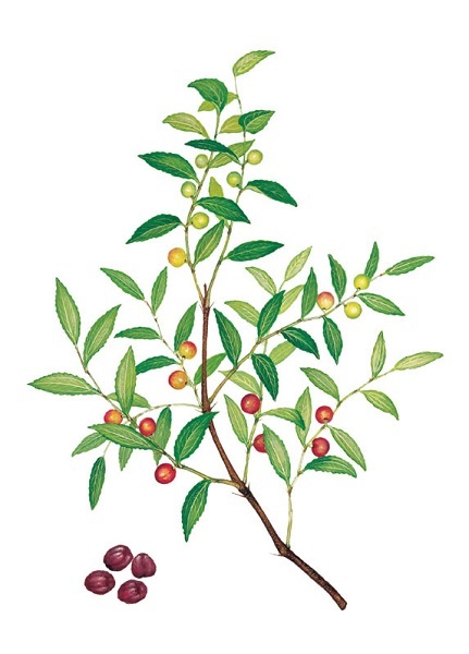 酸枣长在河东川泽地区。酸枣树的纹理很细,木质坚硬,可以做成车轴、勺子、筷子等日常用品。八月可采摘果实。果实又小又圆,且味酸,枣核微圆,形稍长,色赤如丹。