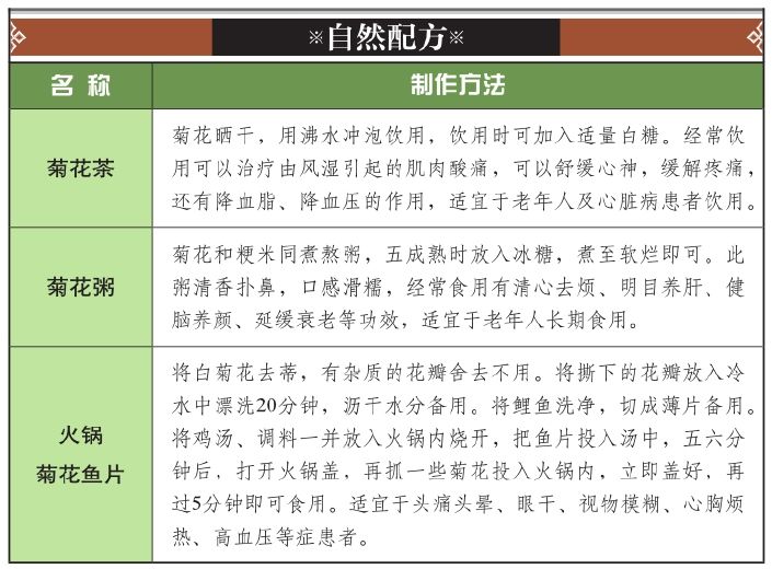 菊花的香气使人头脑清醒,而食用菊花有清热解毒、平肝利目、减肥降压的作用,还可以防治冠心病、高血压等心脑血管疾病,对肝炎也有一定的疗效。