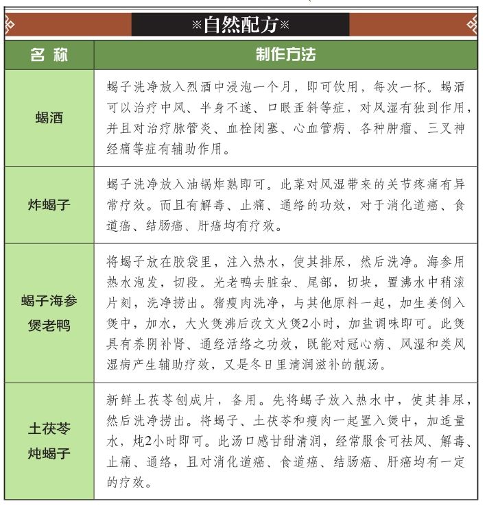 主治:蝎子是治风的要药,风证都可选用蝎子入药,无论大人、小儿均可服用。可以治疗各种邪风瘾疹,以及中风、半身不遂、口眼歪斜、言语不清、手足抽搐等症。