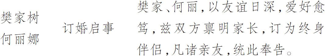丽娜现已与樊君家树订婚,彼此以俱在青年,岁月未容闲度,相约订婚之后,即日同赴欧洲求学。芸窗旧课,喜得重温;舞榭芳尘,实已久绝。纵有阳虎同貌之奇闻,实益曾参杀人之噩耗,特此奉闻,诸维朗照。