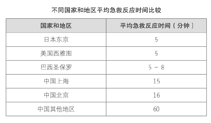 我手上有一份2008年的资料:美国西雅图,急救反应时间在5分钟内,急救半径2~3公里,平均每2万~3万人一辆救护车,急救普及人口达到70%;而中国北京,急救反应时间平均15分钟,急救半径5~7公里,平均每10万人一辆救护车。北京急救中心每天最多时可接到2万多个急救电话,出2000多次车,还是无法满足全部需要。北京举办奥运会期间,要求北京市民每80个人中有一个学会急救,即使这样,急救普及率也远远不及欧美国家。
