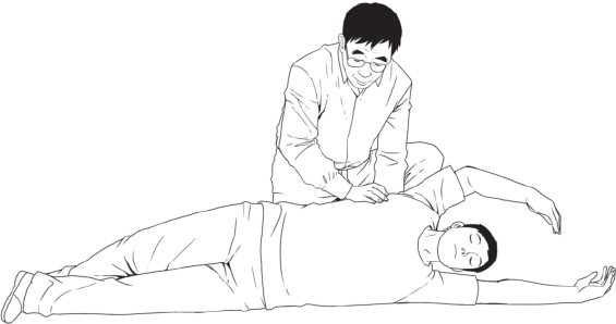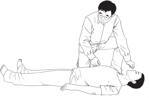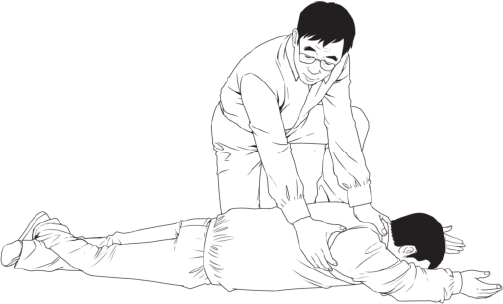 首先,施救者跪在伤者身体的一侧,两膝分开,与肩同宽,且自己的身体要正对伤者的乳头部位。以自己的髋关节为轴,利用上半身的体重和肩部、双臂的力量,垂直向下按压伤者的胸骨。注意!两个手臂要一直保持伸直状态,在按压的时候,手臂要垂直于地面,斜着、歪着、弯着,都不对,而且身体不能晃动,这是保证按压有效的条件之一。