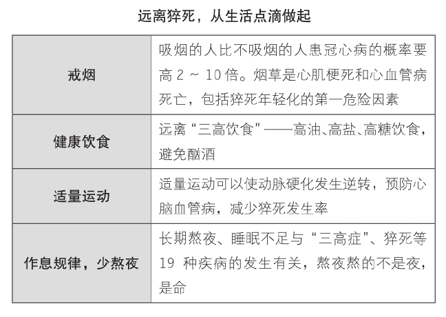 当然,已知的危险因素远不止这些。现代社会,人们生活压力大,我们要倡导健康、科学的生活方式,合理膳食、适量运动、戒烟限酒、心理平衡,让猝死的隐形杀手离我们越来越远。