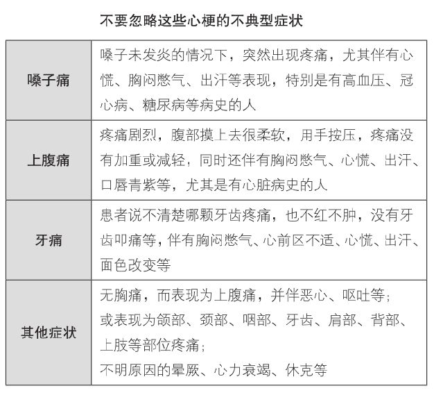 急性心梗的非典型症状还有很多,下面这些表现都可以作为急性心肌梗死的表现出现,应该高度警惕:无胸痛或仅仅自我感觉胸闷、心慌、心前区不适;无胸痛而表现为上腹痛,并可伴恶心、呕吐等,容易误诊为急腹症;无胸痛而表现为颌部、颈部、咽部、牙齿、肩部、背部、上肢等部位疼痛,很容易误诊为骨、关节或软组织等局部病变;不明原因的晕厥、心力衰竭、休克等,都应该想到急性心梗发生的可能。