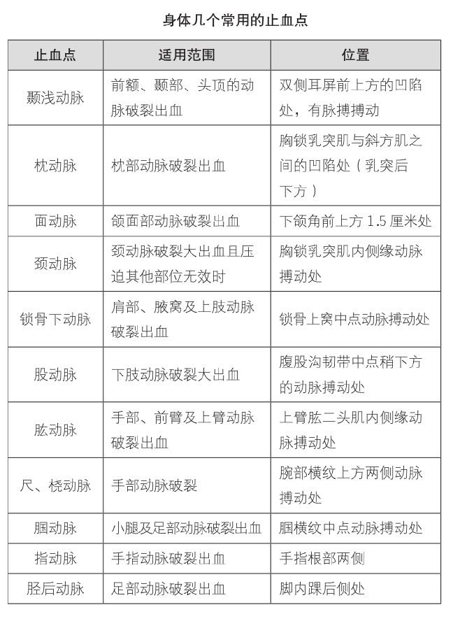 指压止血对大动脉出血的效果是立竿见影的,但它也有个缺点,就是不能持久。用力按压一段时间后,手会酸、会累,压力不够,止血效果就差了。所以,压迫止血点后,如果情况不太凶险了,应该赶紧找个有用的东西进行包扎。