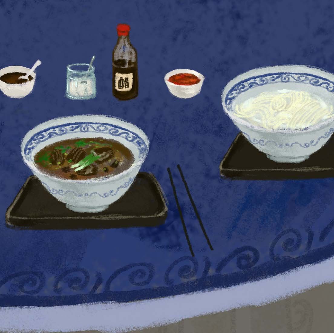 将湖羊肉炖得酥烂,放很浓的香料,放酱油和糖连皮带骨地煮。另外煮一碗面,要生一些,面出锅后会有一个自己变熟的过程,所以七分熟即可,淋上江南的香醋、新鲜的辣椒油,撒一点青蒜。