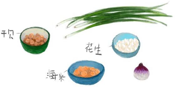 面条/菜籽油/小葱/生抽/老抽/白糖/白胡椒粉/食盐/干贝/花生米/海米/植物油