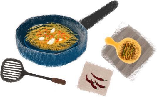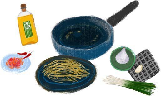 准备好大蒜、蒜苗和剁辣椒,等到土豆丝炸得有点糯的时候,加入这些配料进行翻炒。