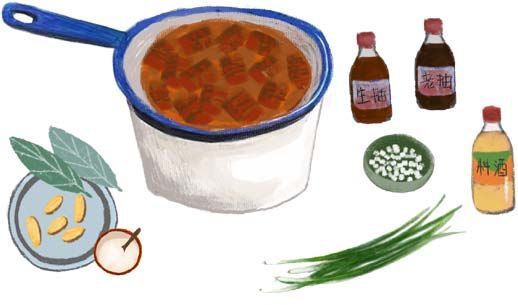 再向锅里倒入适量油,加入冰糖,炒至冰糖融化为深褐色,放入五花肉。向锅里倒入足量的黄酒、少量的老抽、生抽、食盐、香叶、葱段和姜片,汤汁要没过五花肉,大火烧开后转小火慢炖。