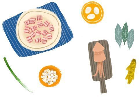 五花肉/鱿鱼/鸡蛋/植物油/葱/姜/冰糖/香叶/黄酒/老抽/生抽/食盐