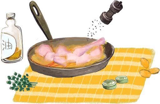 冷锅倒入适量的油,放入姜片、八角、花椒、香叶,炒出香味。将鹅块放入锅中进行煸炒,去腥同时煸出一部分肥油,盛出后备用。