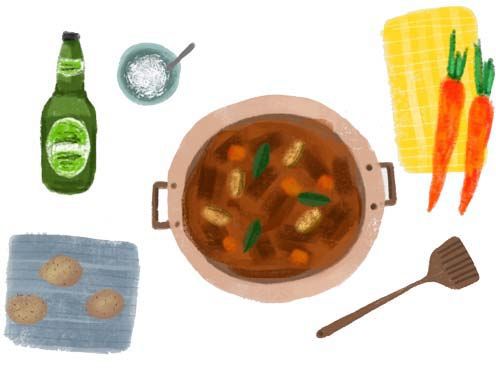 另起一锅,倒入适量油,放入姜片、八角、鹅块、料酒、酱油、白糖、胡椒粉、啤酒,烧开后撇掉浮沫,转小火慢炖四十至六十分钟。想吃素菜,在慢炖过程中可以放入土豆、胡萝卜等辅料;想吃辣,煸炒一份豆瓣加干辣椒酱,作为调料。