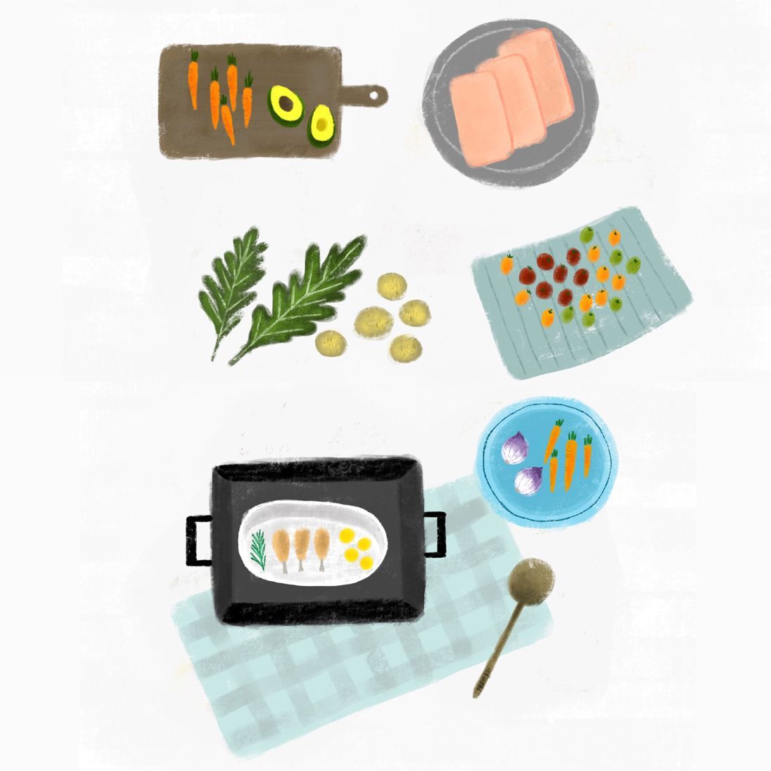 之后去调一种汁——从超市买来迷迭香捣碎,跟橄榄油、海盐、果醋、黑胡椒粉调匀在一起。然后准备红的黄的绿的不同颜色的小番茄、洋葱、胡萝卜、土豆。