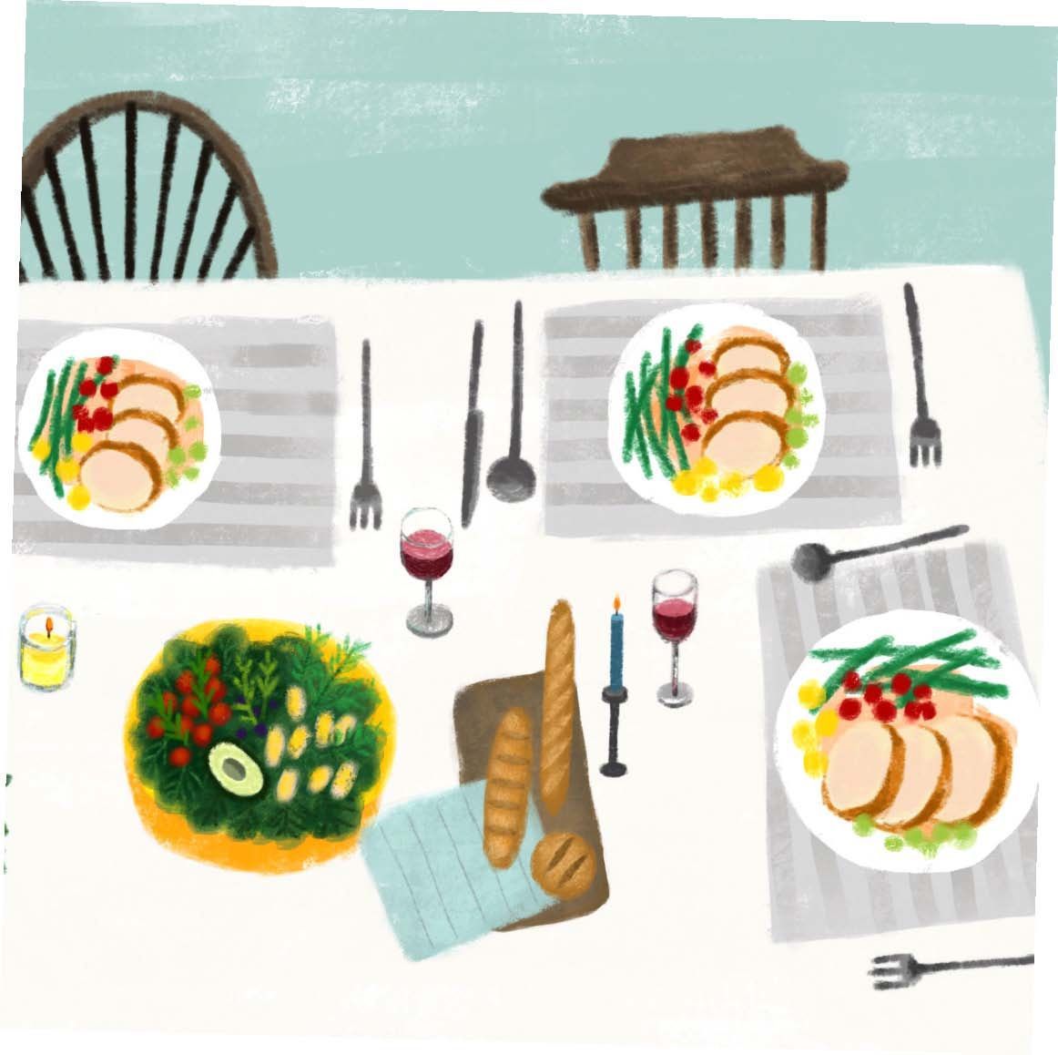 烤鸡肉的同时可以去做沙拉了。买各种你喜欢的菜,我喜欢生菜、番茄、牛油果,一点芝士,撕几片火腿。再准备点沙拉汁,用橄榄油就非常好,或者意大利的果醋。这样三四个人的晚餐就足够了。此外,主食做面包,或者买一根法棍或者粗粮面包,一餐就非常丰富。