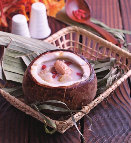 别看椰子其貌不扬的,其实它浑身都是宝。椰肉、椰汁和椰油都有一定药用价值,能够强身健体、益气美容。这道汤里面加入的鸡肉可以滋肝补虚,淮山和枸杞则分别对于胃和肾脏具有一定的好处。放在一起,身体的五脏都被滋润了个遍。