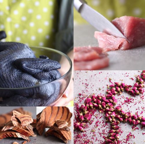 ●乌鸡600g●鸡血藤10g详见食味索引●食用玫瑰花5g详见食味索引●瘦肉50g●盐适量