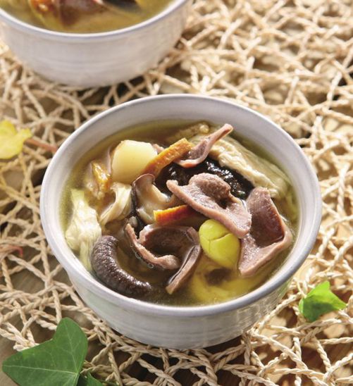 ●荸荠250g详见食味索引●腐竹100g●猪舌1条●白果适量●干冬菇20g●陈皮10g●姜片5g●盐适量
