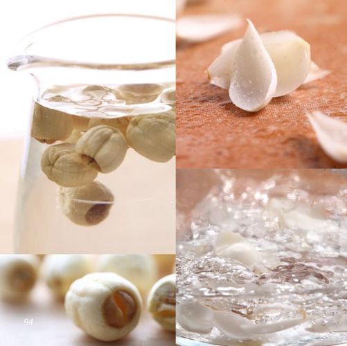 莲子皮薄如纸,剥除很费时间,可将莲子放入开水中加入适量老碱,搅拌均匀后浸泡片刻,倒入淘米箩内用力揉搓即可;其次是去莲芯,莲芯虽对人体有好处,但味苦涩,所以需将莲子泡软后剥开去芯。