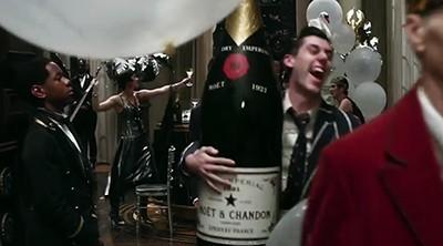 你肯定忘不了电影里这个硕大的广告植入。在泳池上跳舞的舞女、醉倒在纸醉金迷中的宾客,捧着一瓶瓶巨型的Moët & Chandon,穿梭在盖茨比的豪宅里。