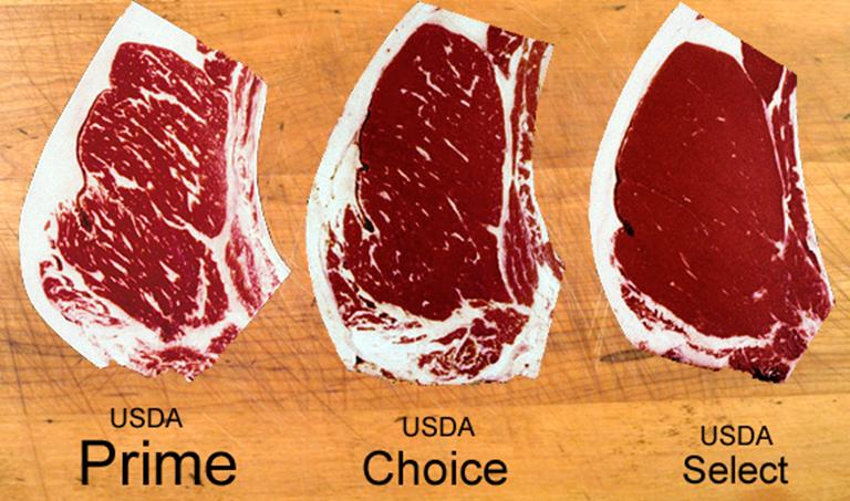 从左到右依次为被认定为Prime,Choice,Select的牛肉(图片引用自博客The Unorthodox Epicure,原始来源USDA)