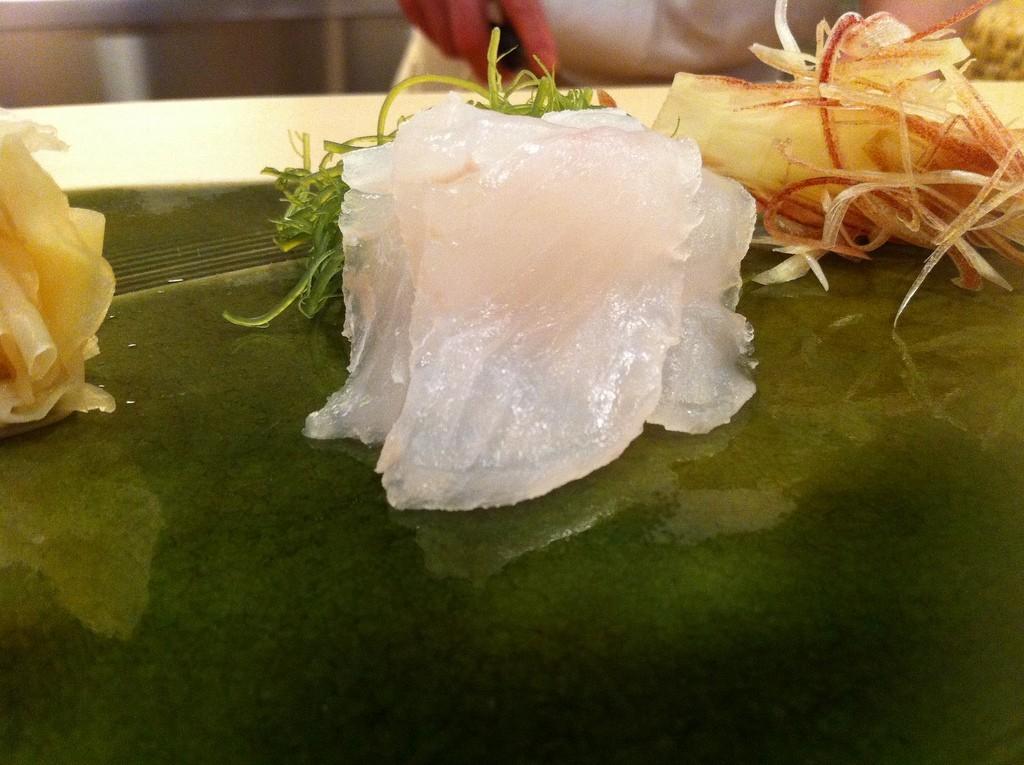 比较tricky的地方是你以什么方式将生鱼片寿司送进嘴里。完全不用额外蘸酱油的寿司,大可以按照它放上架子的样子送进嘴里(米饭朝下、生鱼片朝上)。由于师傅理应照顾到客人嘴的大小(Supposedly……),所以此时即使是女士,将寿司整个送进嘴里也不会产生令人尴尬的视觉效果,尽可放心吃。如果要蘸酱汁,可以仿效这种步骤(我感觉略有点难度),用生鱼片的一面蘸酱汁,而尽可能不要让酱汁碰到米饭——因为醋饭本身有味道,酱汁会破坏这种味道。