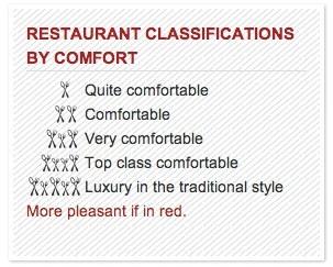 米其林叉叉勺勺:星星不是轮胎人评价体系的唯一标准,比较常见的还有轮胎人叉+匙评价体系,等级从1到5,是对餐厅舒适度的打分,叉匙越多越舒适(标志一般用黑色显示,特别牛逼时改用红色)。并不是所有餐厅都同时有两项评级(不确定是评级跟不上,还是有些餐馆压根懒得挂叉子和调羹),有的门口就只看得见星星,两套体系是互相独立的。