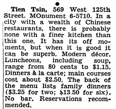 话说在1962年的某个周五,《纽约时报》的读者突然发现,在教人如何擦拭餐具的文章旁边,多了一小长条,标题是“Directory to Dinning”。小长条由4个小豆腐块组成,其中一个是关于一家开在纽约哈林区的中国餐馆“Tien Tsin”的,文章写道,「在这个开满了中国餐馆的地段,也许没有别的餐馆比它的厨房更好了」。这条小小的「餐饮目录」对每家餐馆仅作了一句评述,其不到100个英文单词的描述里大部分都用于罗列地址和人均价格——跟现在我们自己跑到大众点评上写的点评神似,而这就是这份国际大报的第一个餐饮section了。